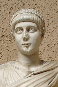 Reverso - Imperador em pé, cabeça à esquerda, segurando Vitória no Globo na mão esquerda, mulher ajoelhada